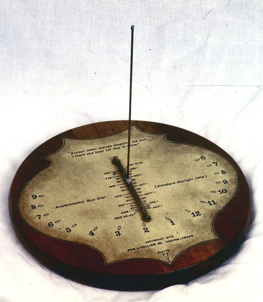this analemantic sun dial was designed to be scaled up with an analemma (the vertical pole that cast the shadow to tell time) that was 10 ft tall. this type of sundial, designed for its exact location latitude and longitude when properly installed, can be set to the current day's date by sliding the analemma along a bar, and will show the exact local time.